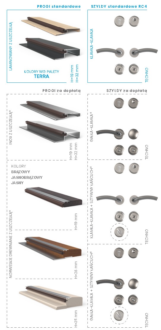 Szeroka gama oklein drewnopodobnych, laminatów i kolorów RAL pozwala dopasować drzwi do stylistyki wnętrza.