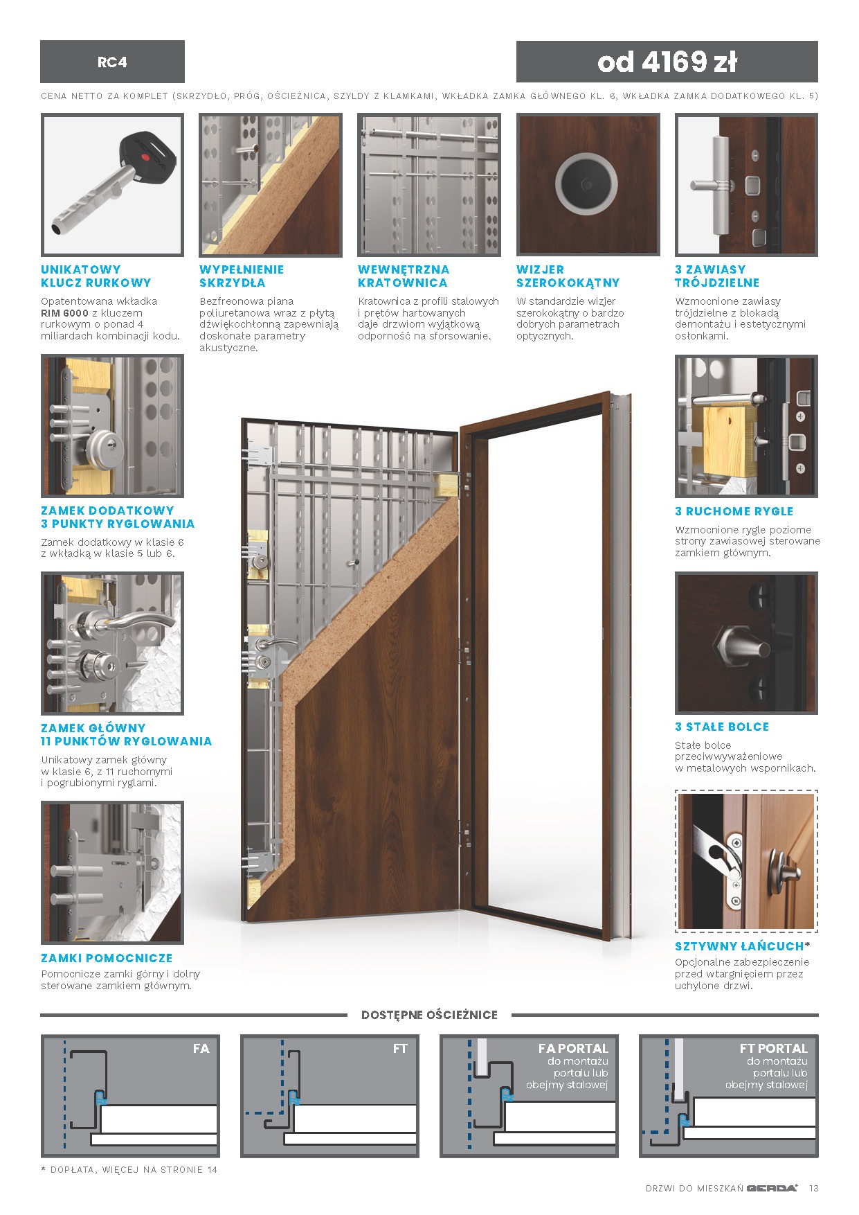 Rygle główne i pomocnicze blokują skrzydło w ramie na całym obwodzie, co skutecznie uniemożliwia jego wyważenie.